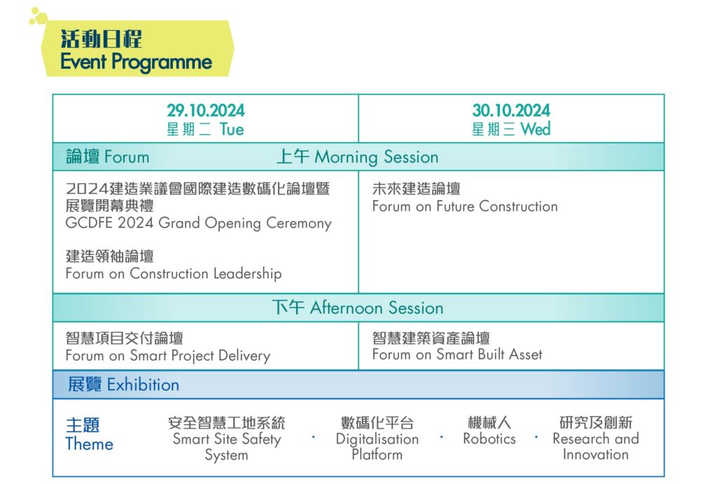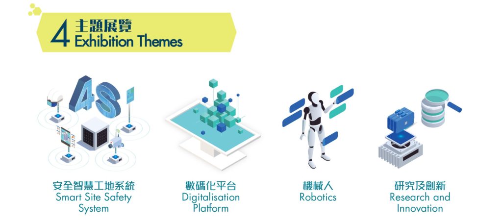 論壇部分陣容鼎盛,集結30多位來自海外、內地及本地的專家,分享建造業數碼化的前瞻遠景、未來趨勢及實際項目經驗4大主題展覽,包括 4S安全智慧工地系統 、機械人 、數碼化平台和研究及創新 ,探索建造數碼化嘅最新發展。