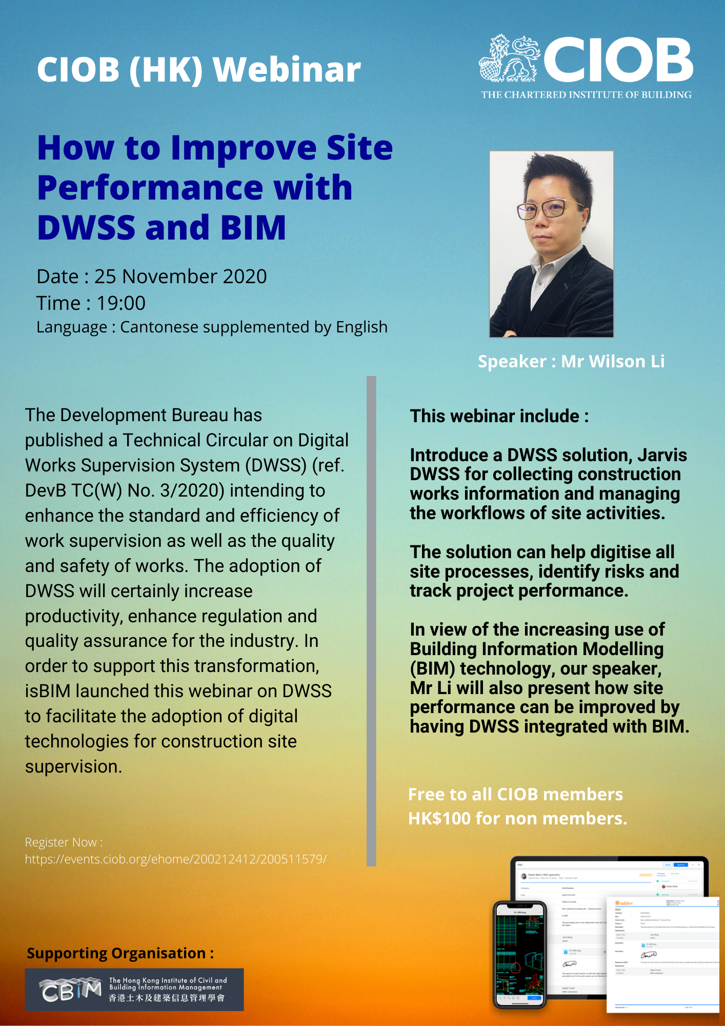 In this webinar, our speaker, Mr Wilson Li will introduce a DWSS solution, Jarvis DWSS for collecting construction works information and managing the workflows of site activities. The solution can help digitise all site processes, identify risks and track project performance. In view of the increasing use of Building Information Modelling (BIM) technology, Mr Li will also present how site performance can be improved by having DWSS integrated with BIM.