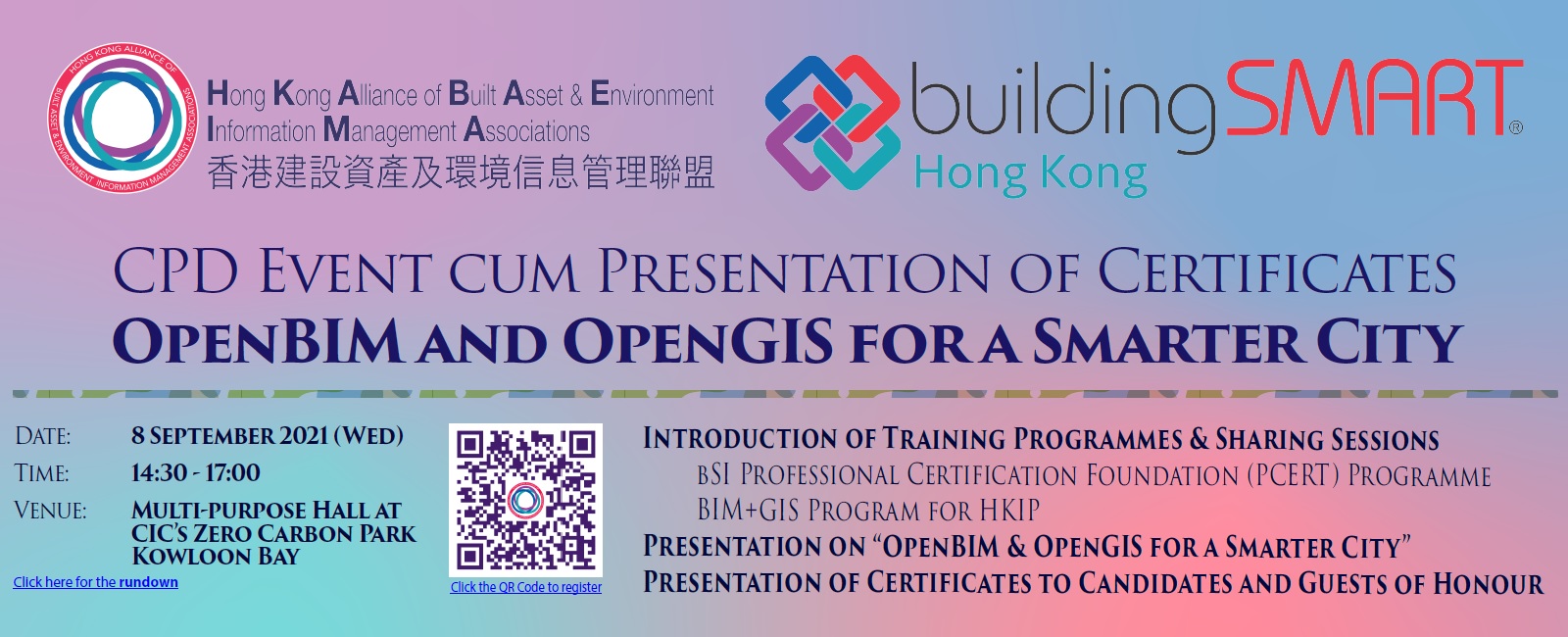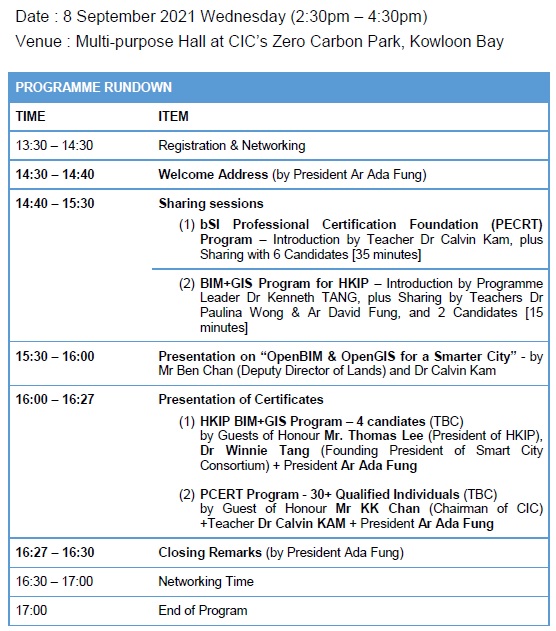 The Hong Kong Alliance of Built Asset & Environment Information Management Associations (HKABAEIMA) will hold the CPD Event cum Presentation of Certificates (OpenBIM and OpenGIS for a Smarter City) at Multi-purpose Hall at CIC’s Zero Carbon Park, Kowloon Bay on 08th September, 2021 (Wednesday). Our Institute (HKICBIM) as one of HKABAEIMA’s founding members, we are honored to invite all HKICBIM members to join the series of training classes on different topics to strengthen the understanding of transiting from BIM to openBIM.