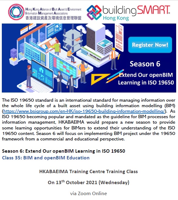 The Hong Kong Alliance of Built Asset & Environment Information Management Associations (HKABAEIMA) will hold the training class (BIM and openBIM Education) in virtual meeting room on 13th Oct, 2021 (Wednesday). Our Institute (HKICBIM) as one of HKABAEIMA’s founding members, we are honored to invite all HKICBIM members to join the series of training classes on different topics to strengthen the understanding of transiting from BIM to openBIM.