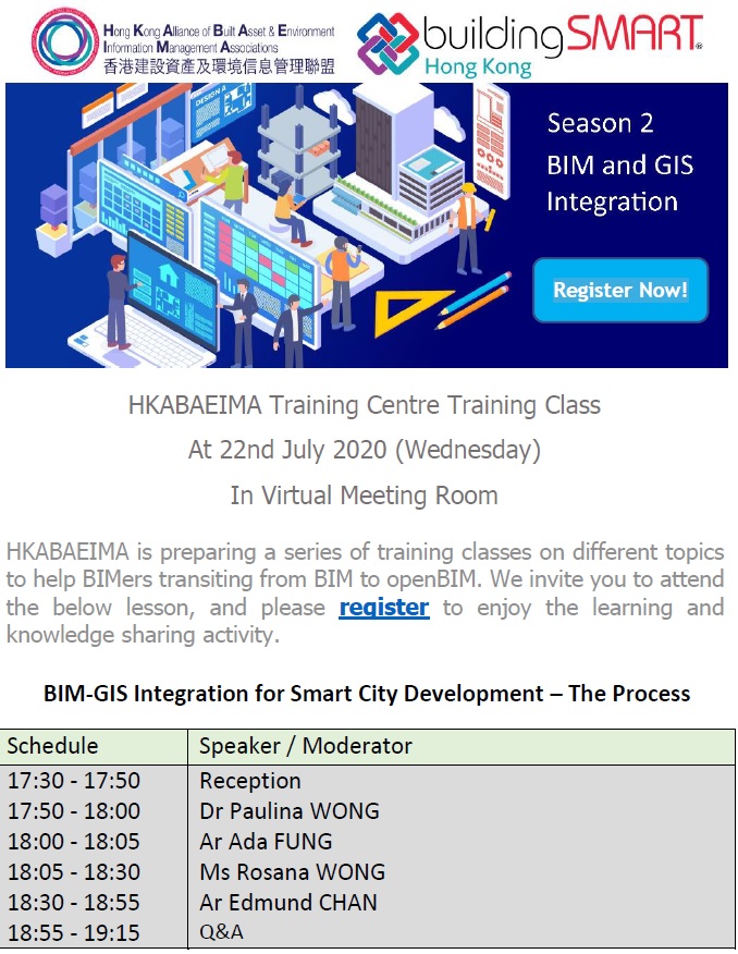 The Hong Kong Alliance of Built Asset & Environment Information Management Associations (HKABAEIMA) will hold the training class (BIM-GIS Integration for Smart City Development – The Process) in virtual meeting room on 22th July, 2020 (Wednesday).