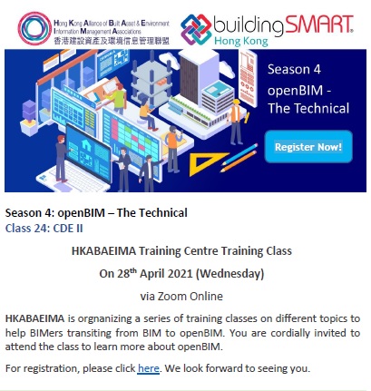 The Hong Kong Alliance of Built Asset & Environment Information Management Associations (HKABAEIMA) will hold the training class (Common Data Environment (CDE) II)  in virtual meeting room on 28th April, 2021 (Wednesday).
