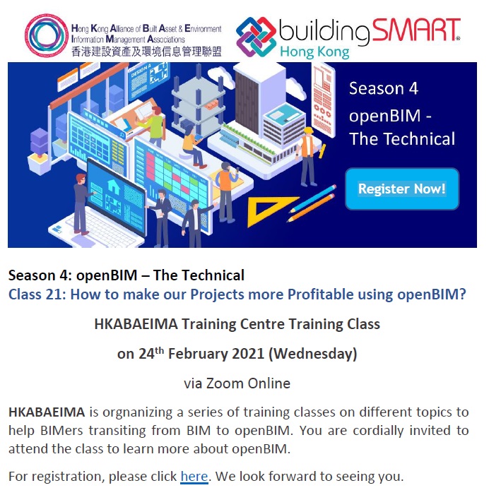 The Hong Kong Alliance of Built Asset & Environment Information Management Associations (HKABAEIMA) will hold the training class (How to make our Projects more Profitable using openBIM?) in virtual meeting room on 24th February, 2021 (Wednesday).