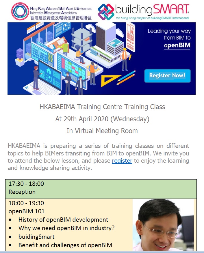 The Hong Kong Alliance of Built Asset & Environment Information Management Associations (HKABAEIMA) will hold the training class (openBIM 101) in virtual meeting room on 29th April, 2020 (Wednesday).