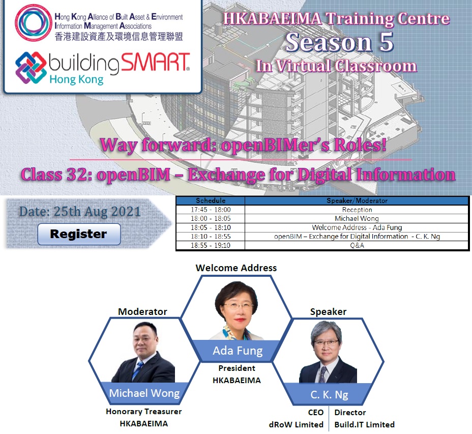 The Hong Kong Alliance of Built Asset & Environment Information Management Associations (HKABAEIMA) will hold the training class (openBIM – Exchange for Digital Information)  in virtual meeting room on 25th August, 2021 (Wednesday). Our Institute (HKICBIM) as one of HKABAEIMA’s founding members, we are honored to invite all HKICBIM members to join the series of training classes on different topics to strengthen the understanding of  transiting from BIM to openBIM.