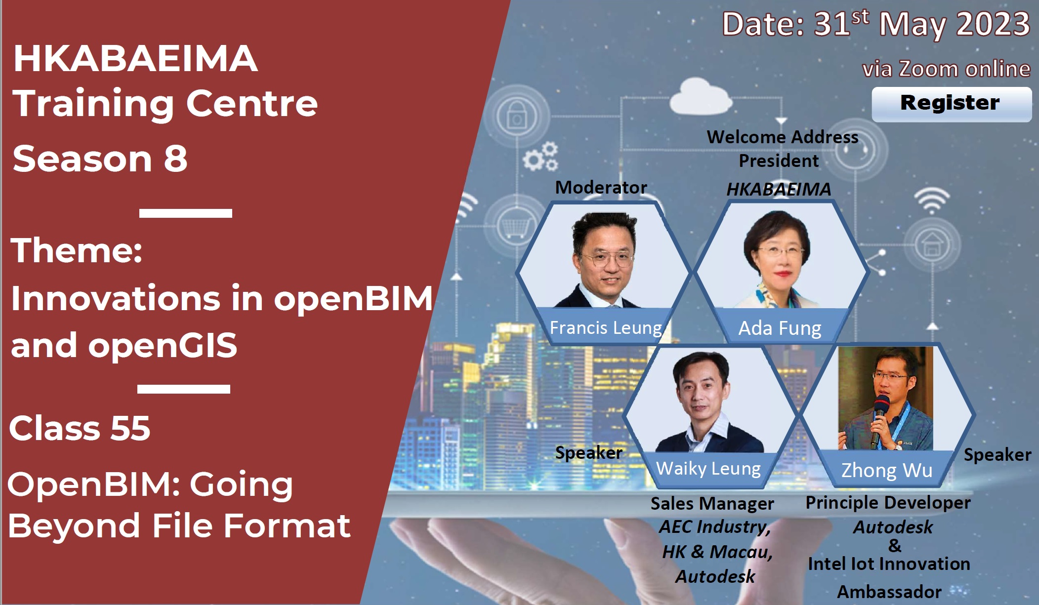 The Hong Kong Alliance of Built Asset & Environment Information Management Associations (HKABAEIMA) will hold the training class (OpenBIM: Going Beyond File Format) in virtual meeting room on 31st May, 2023 (Wednesday). Our Institute (HKICBIM) as one of HKABAEIMA’s founding members, we are honored to invite all HKICBIM members to join the series of training classes on different topics to strengthen the understanding of innovations in openBIM and openGIS.