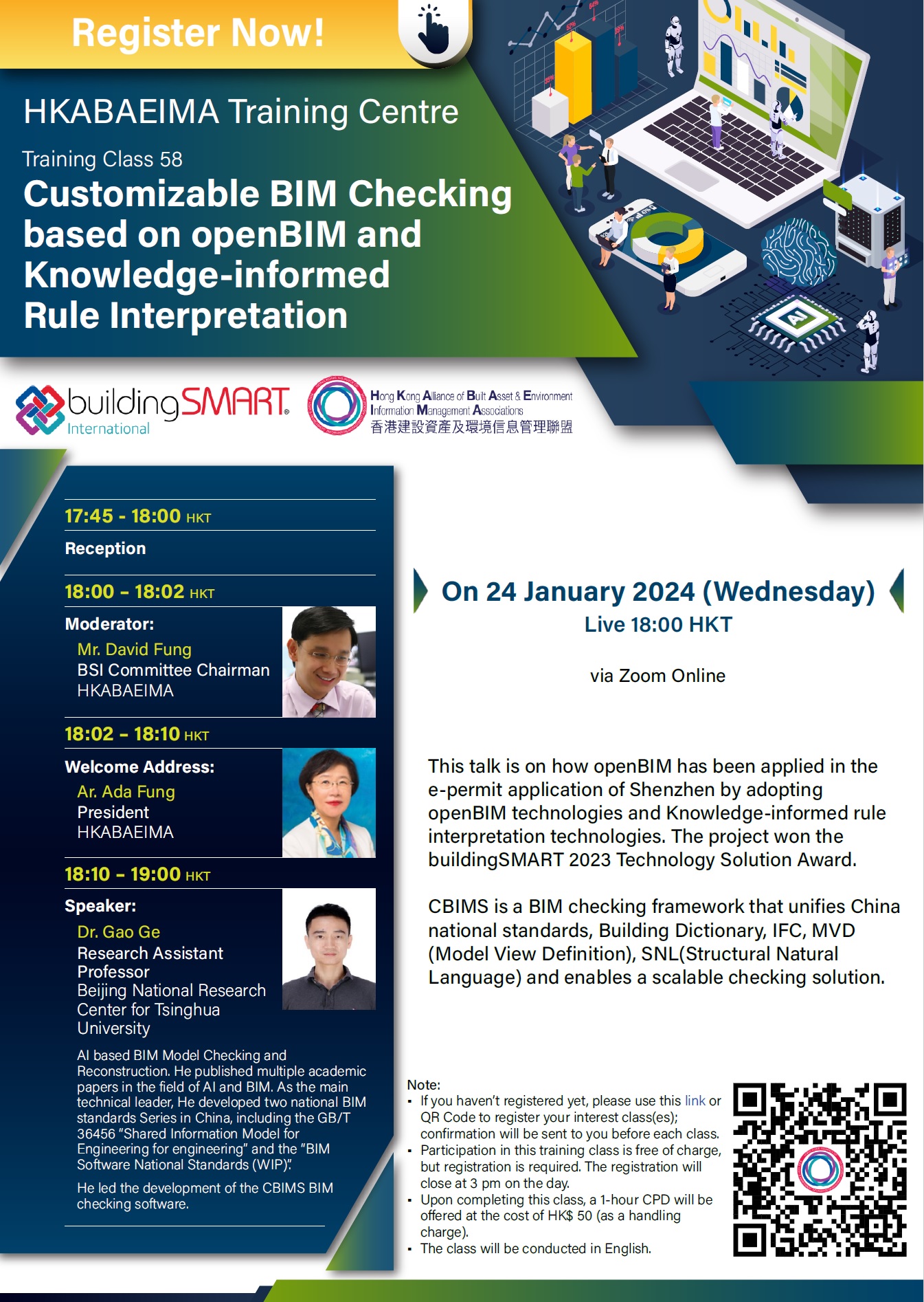 openBIM and Knowledge-informed Rule Interpretation)  in virtual meeting room on 24th Jan, 2024 (Wednesday). Our Institute (HKICBIM) as one of HKABAEIMA’s founding members, we are honored to invite all HKICBIM members to join the series of training classes on different topics to strengthen the understanding of  innovations in openBIM and openGIS.