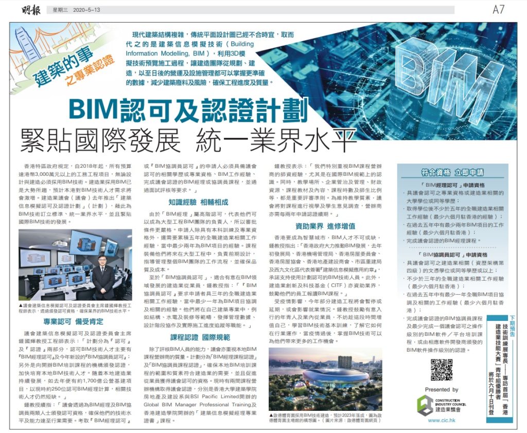 The Inspiring Construction Stories has interviewed Ir Prof. CHUNG Kwok-fai, Chairperson of BIM Certification and Accreditation Board to introduce the latest development of the CIC BIM Certification and Accreditation Schemes and the prospects of BIM personnel.