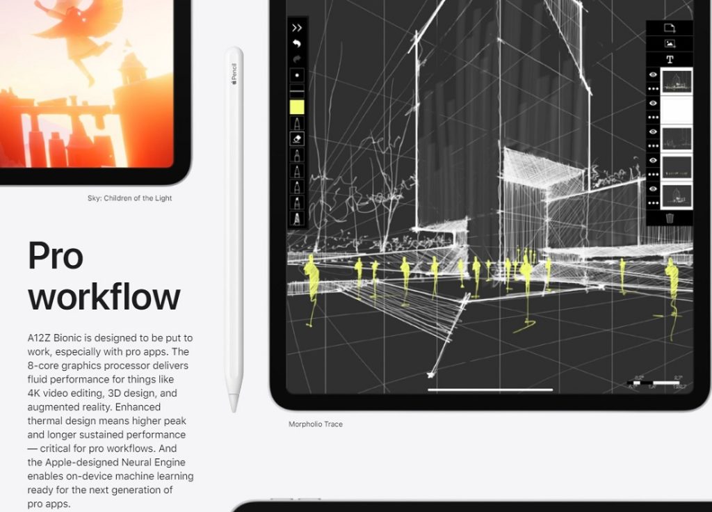 Equipped with the A12Z Bionic chip, the new iPad Pro is faster and more powerful than many PC. With the powerful graphic processor, it means it can conduct the modelling tasks more performance and realism (i.e. Augmented reality (AR)).